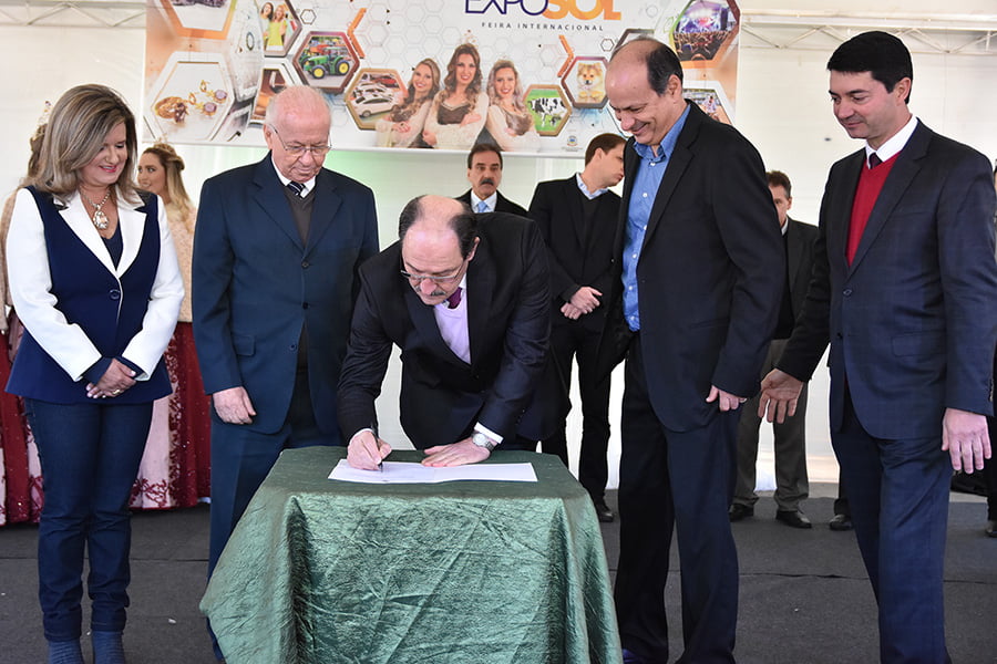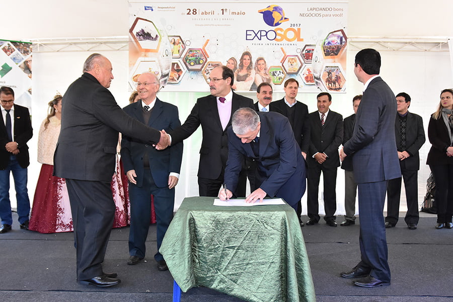 Durante a solenidade de abertura da EXPOSOL 2017 – Feira Internacional, aconteceu a assinatura de dois convênios com o Governo do Estado, via BRDE. O primeiro foi com a Coagrisol, em parceria com Sicredi, que celebraram financiamento no valor de R$ 4 milhões, com a finalidade de os associados integralizarem capital na cooperativa, através da linha Pronaf Cotas Partes.